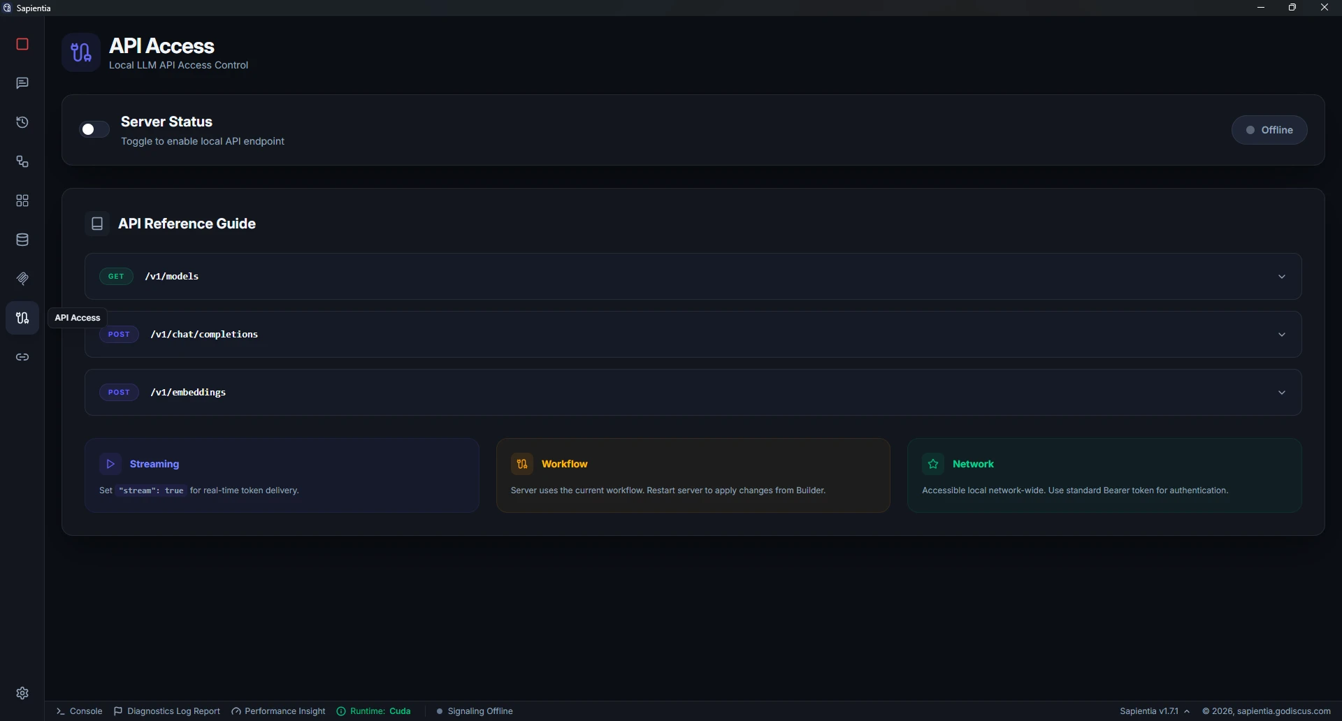 Built-in HTTP server for programmatic access to AI capabilities. Connect external applications and tools to Sapientia, all running locally on your machine.