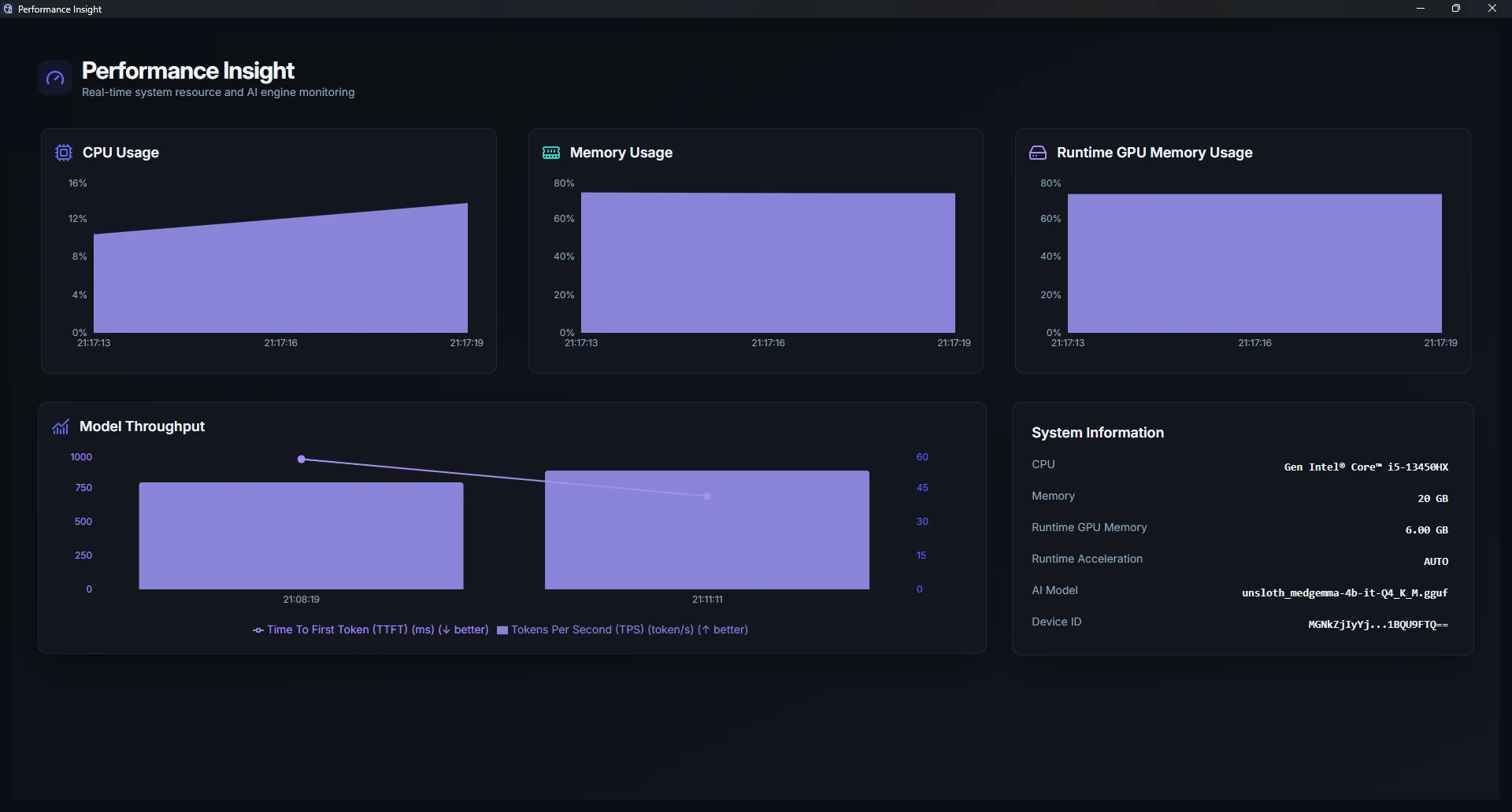 Real-time telemetry displays CPU, RAM, VRAM usage, and token generation speed. Optimize your workflows with detailed performance metrics and resource utilization data.